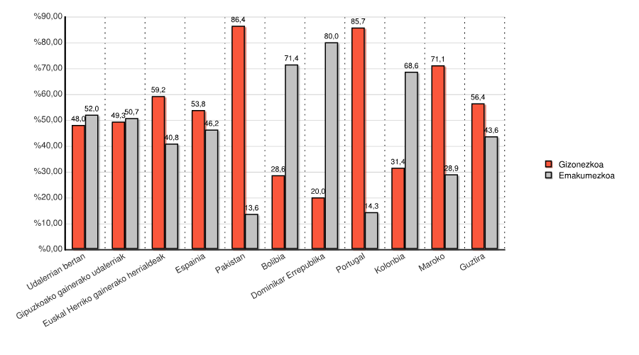 | Euskal Herriko gainerako herrialdeak | 45 | 59,2 | 31 | 40,8 | 76 | 100,0 |