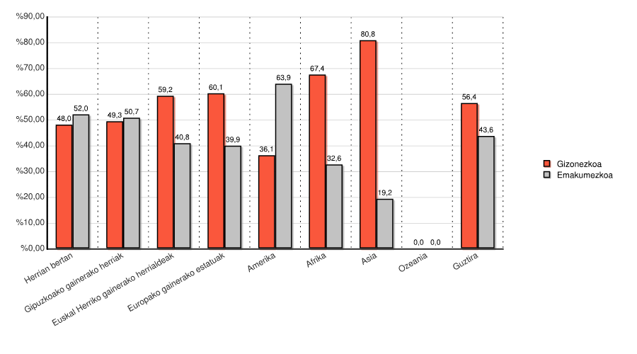 | Euskal Herriko gainerako herrialdeak | 45 | 59,2 | 31 | 40,8 | 76 | 100,0 |