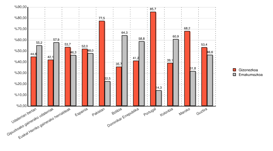 | Euskal Herriko gainerako herrialdeak | 44 | 53,7 | 38 | 46,3 | 82 | 100,0 |