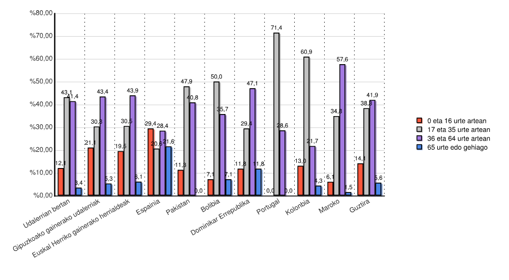 | Euskal Herriko gainerako herrialdeak | 0 | 0,0 | 0 | 0,0 | 0 | 0,0 | 0 | 0,0 | 82 | 100,0 |