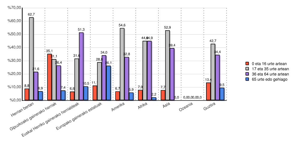 | Kontinentea | 0 eta 16 urte artean | 17 eta 35 urte artean | 36 eta 64 urte artean | 65 urte edo gehiago | Guztira | |||||