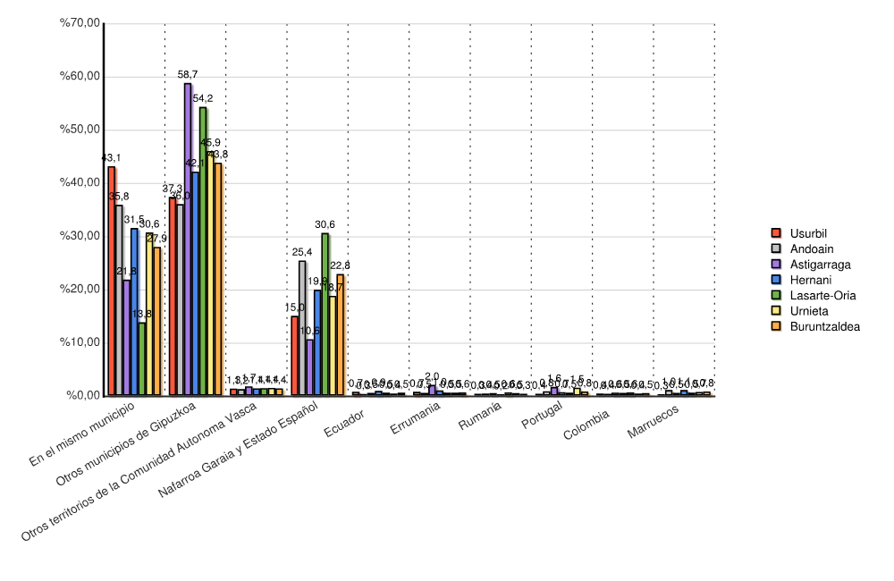 | Otros municipios de Gipuzkoa | 3.683 | 58,7 | 5.269 | 36,0 | 8.510 | 42,1 | 9.541 | 54,2 | 2.857 | 45,9 | 2.300 | 37,3 | 31.372 | 43,8 |