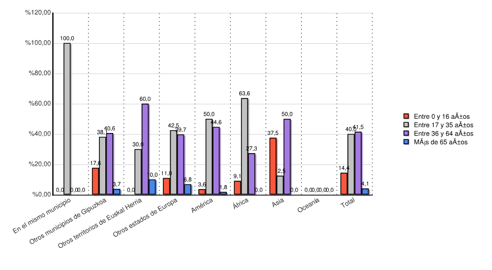 | Otros municipios de Gipuzkoa | 1 | 0,3 | 18 | 5,6 | 35 | 10,8 | 107 | 33,1 | 106 | 32,8 | 56 | 17,3 | 323 | 100,0 |