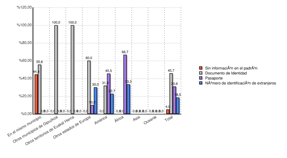 | Continente | Sin información en el padrón | Documento de Identidad | Pasaporte | Número de identificación de extranjeros | Total | |||||
