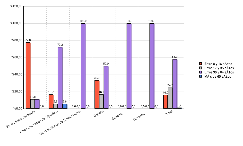 | Otros municipios de Gipuzkoa | 3 | 16,7 | 1 | 5,6 | 13 | 72,2 | 1 | 5,6 | 18 | 100,0 |
