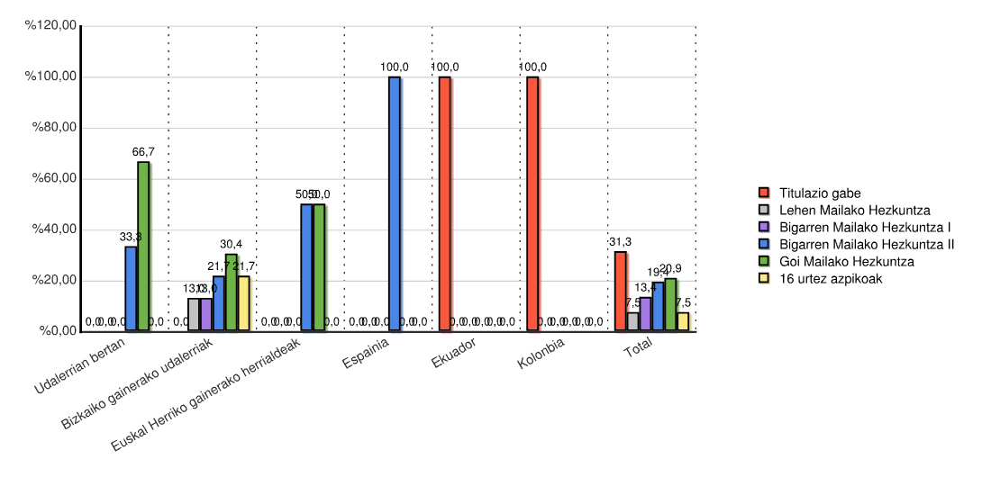| Estatua | Titulazio gabe | Lehen Mailako Hezkuntza | Bigarren Mailako Hezkuntza I | Bigarren Mailako Hezkuntza II | Goi Mailako Hezkuntza | 16 urtez azpikoak | Guztira | |||||||