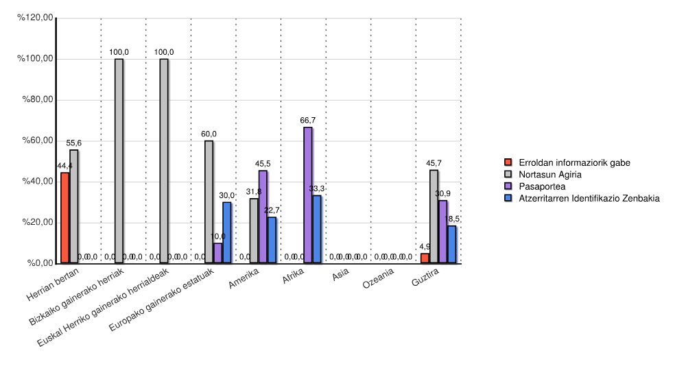 | Kontinentea | Erroldan informaziorik gabe | Nortasun Agiria | Pasaportea | Atzerritarren Identifikazio Zenbakia | Guztira | |||||