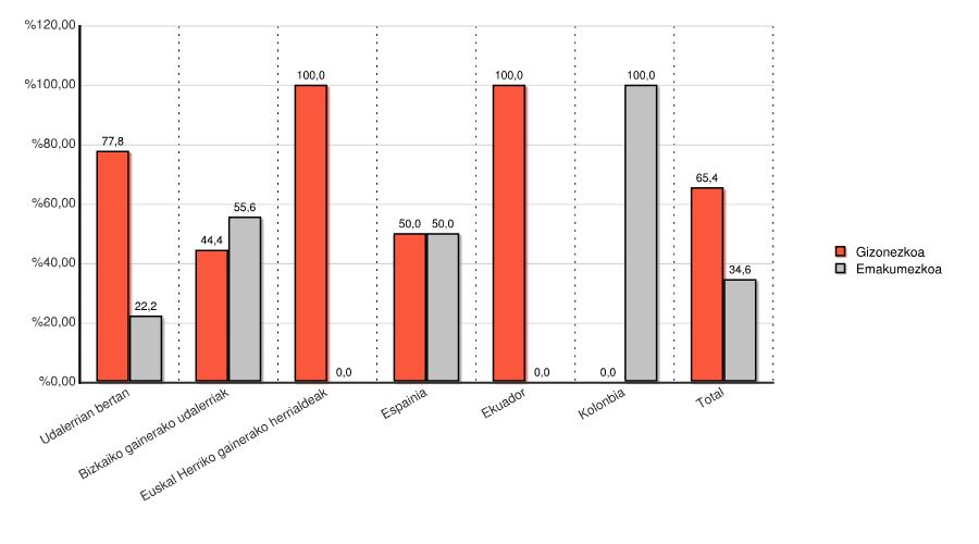 | Udalerrian bertan | 7 | 77,8 | 2 | 22,2 | 9 | 100,0 |