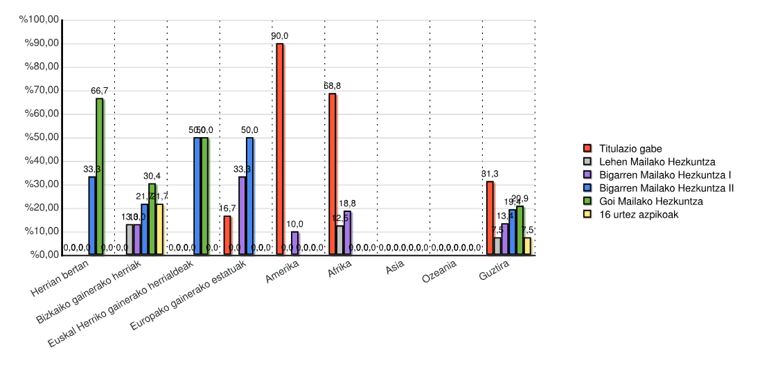 | Kontinentea | Titulazio gabe | Lehen Mailako Hezkuntza | Bigarren Mailako Hezkuntza I | Bigarren Mailako Hezkuntza II | Goi Mailako Hezkuntza | 16 urtez azpikoak | Guztira | |||||||