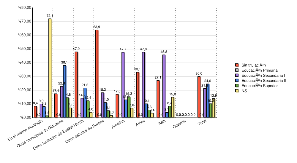 ContinenteSin titulaciónEducación PrimariaEducación Secundaria IEducación Secundaria IIEducación SuperiorNSTotal