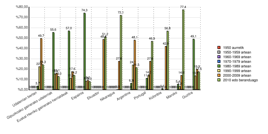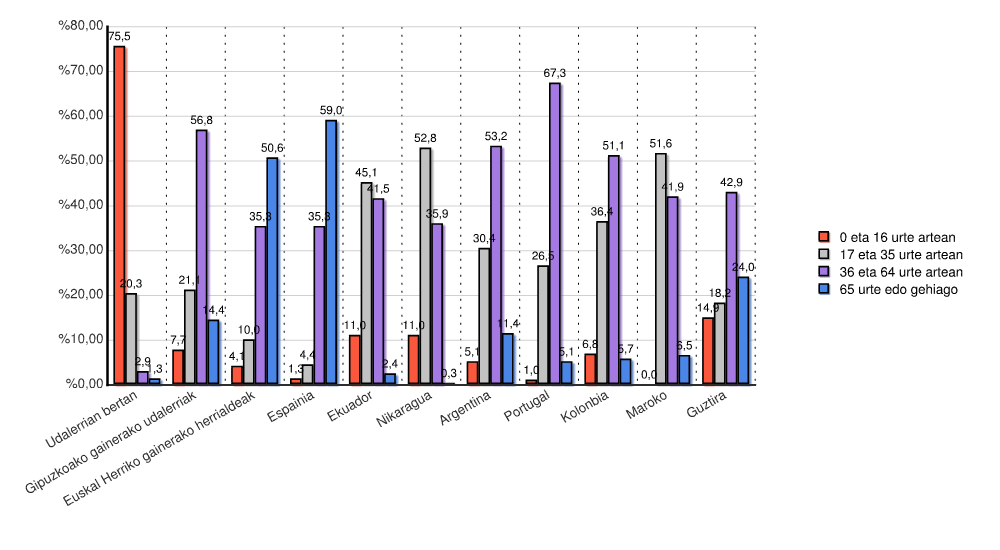 | Euskal Herriko gainerako herrialdeak | 0 | 0,0 | 0 | 0,0 | 0 | 0,0 | 0 | 0,0 | 346 | 57,0 | 68 | 11,2 | 107 | 17,6 | 86 | 14,2 | 607 | 100,0 |