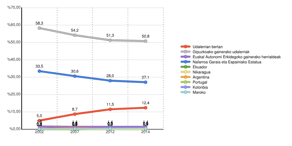 | Gipuzkoako gainerako herriak | 10.155 | 58,3 | 9.541 | 54,2 | 9.197 | 51,3 | 9.193 | 50,8 |
