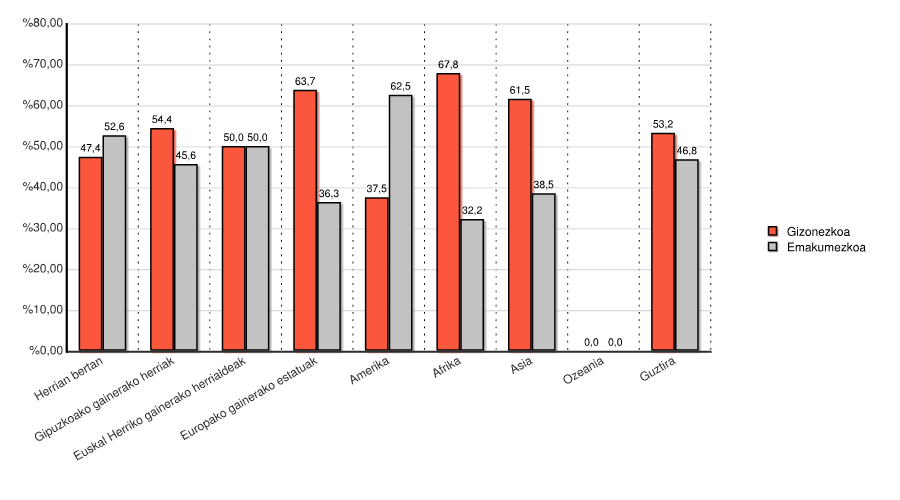| Euskal Herriko gainerako herrialdeak | 9 | 50,0 | 9 | 50,0 | 18 | 100,0 |