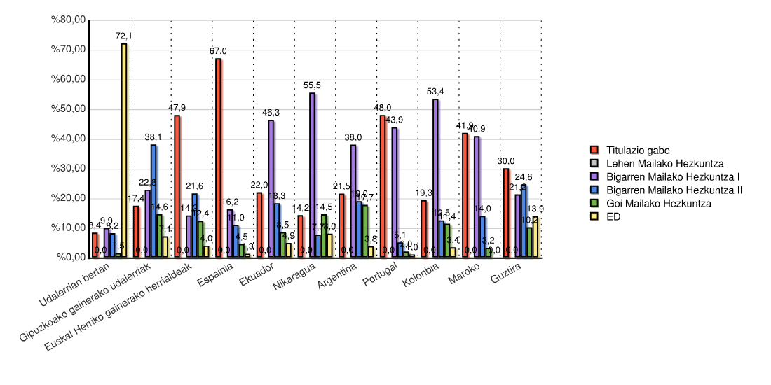 | Estatua | Titulazio gabe | Lehen Mailako Hezkuntza | Bigarren Mailako Hezkuntza I | Bigarren Mailako Hezkuntza II | Goi Mailako Hezkuntza | ED | Guztira | |||||||