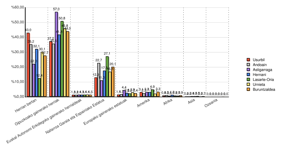 | Gipuzkoako gainerako herriak | 9.193 | 50,8 | 5.222 | 35,6 | 3.154 | 57,0 | 8.184 | 41,8 | 2.838 | 45,8 | 2.297 | 37,2 | 30.888 | 44,0 |
