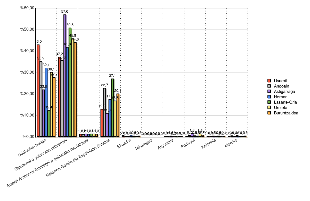 | Udalerrian bertan | 2.242 | 12,4 | 5.160 | 35,2 | 1.220 | 22,0 | 6.289 | 32,1 | 1.867 | 30,1 | 2.651 | 43,0 | 19.429 | 27,7 |