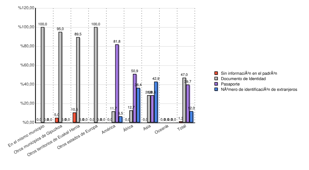 | Continente | Sin información en el padrón | Documento de Identidad | Pasaporte | Número de identificación de extranjeros | Total | |||||