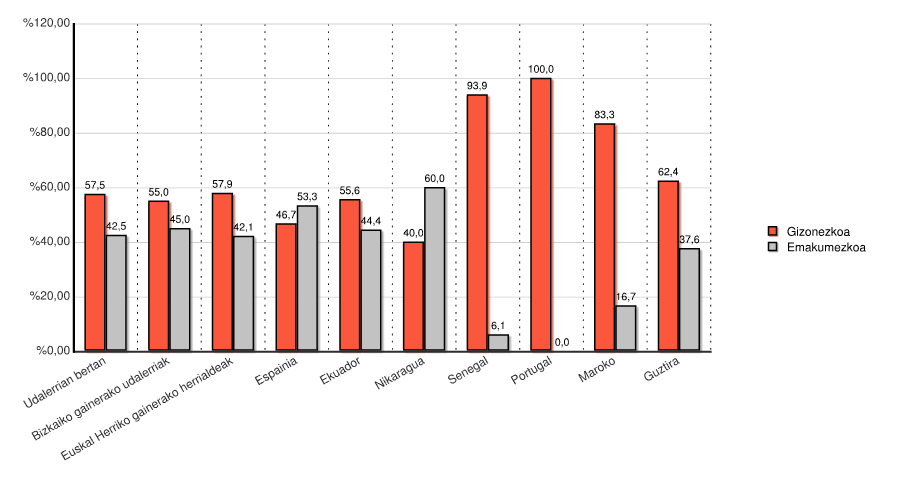 | Euskal Herriko gainerako herrialdeak | 11 | 57,9 | 8 | 42,1 | 19 | 100,0 |