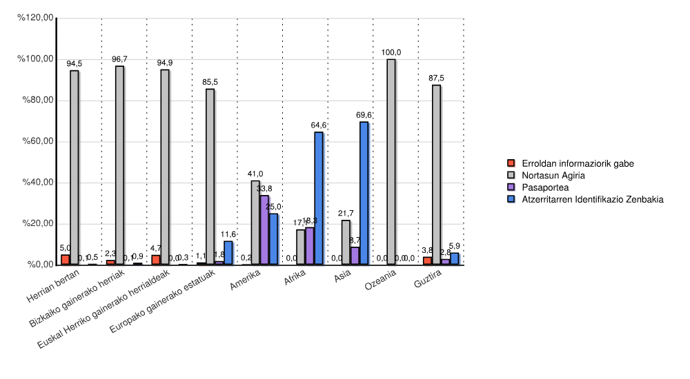 | Kontinentea | Erroldan informaziorik gabe | Nortasun Agiria | Pasaportea | Atzerritarren Identifikazio Zenbakia | Guztira | |||||