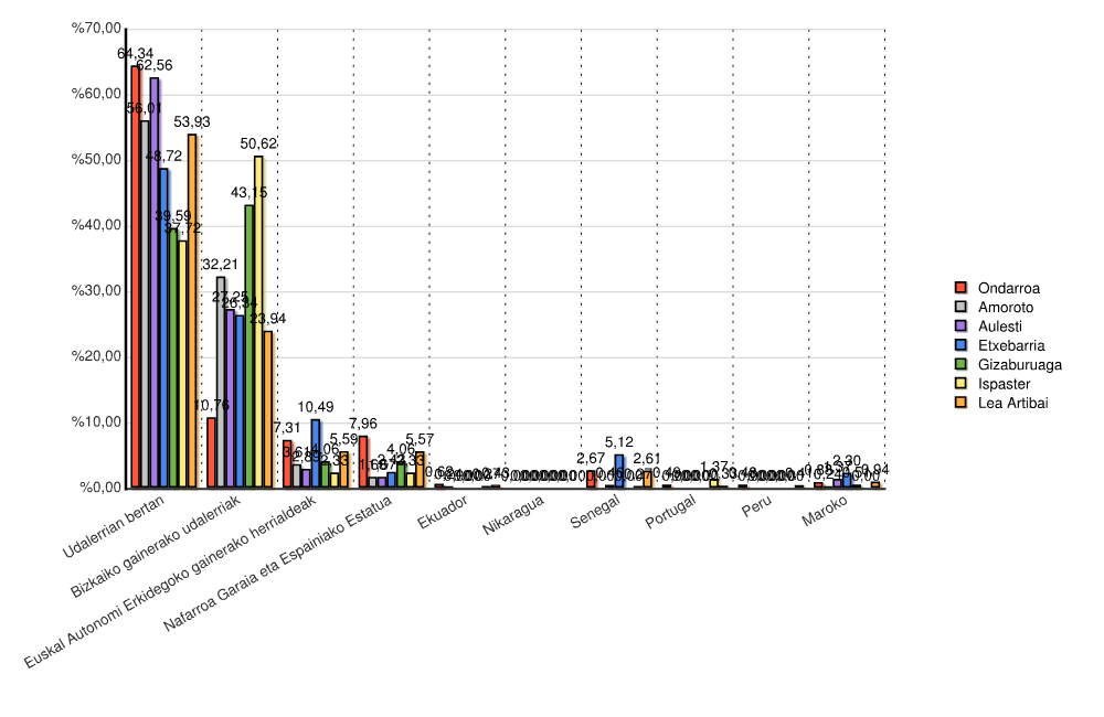 | Udalerrian bertan | 5.401 | 64,3 | 233 | 56,0 | 411 | 62,6 | 381 | 48,7 | 78 | 39,6 | 275 | 37,7 | 3.911 | 53,5 | 2.528 | 49,9 | 132 | 31,1 | 160 | 33,8 | 493 | 39,4 | 80 | 19,8 | 14.083 | 53,9 |
