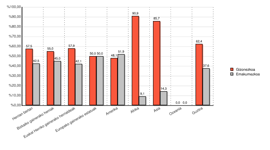 | Euskal Herriko gainerako herrialdeak | 11 | 57,9 | 8 | 42,1 | 19 | 100,0 |