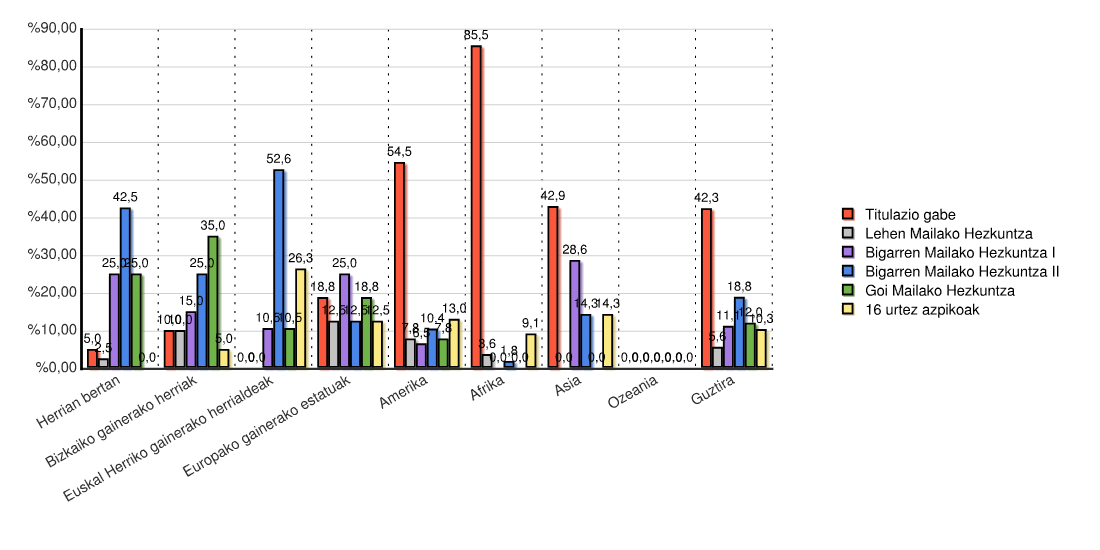 | Kontinentea | Titulazio gabe | Lehen Mailako Hezkuntza | Bigarren Mailako Hezkuntza I | Bigarren Mailako Hezkuntza II | Goi Mailako Hezkuntza | 16 urtez azpikoak | Guztira | |||||||