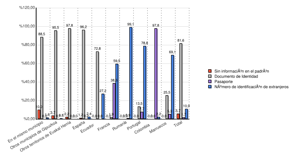 | Estado | Sin información en el padrón | Documento de Identidad | Pasaporte | Número de identificación de extranjeros | Total | |||||