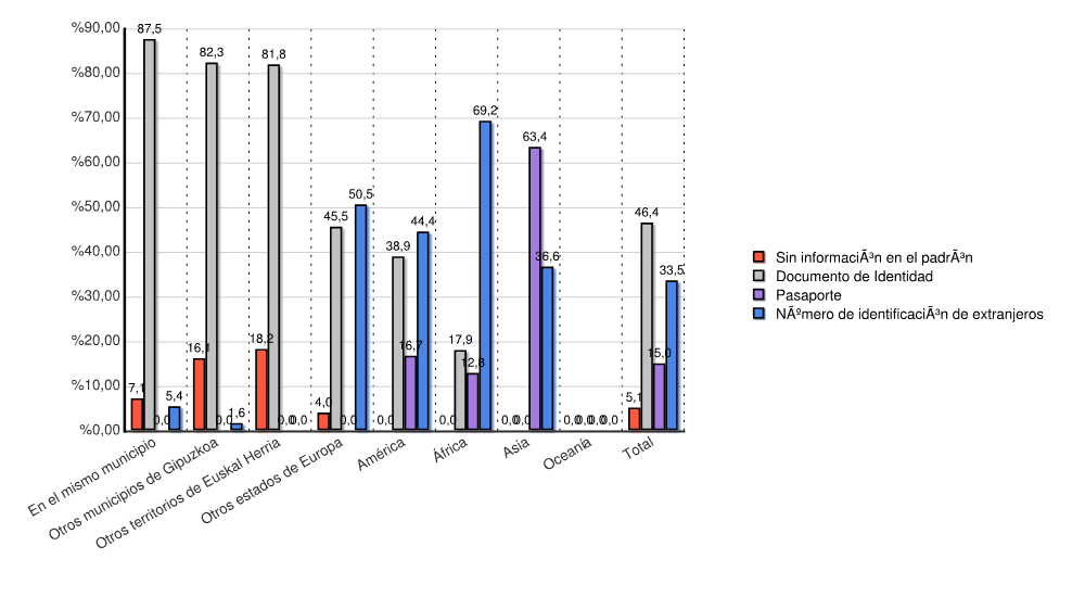 | Continente | Sin información en el padrón | Documento de Identidad | Pasaporte | Número de identificación de extranjeros | Total | |||||