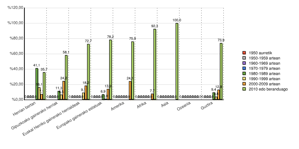 | Euskal Herriko gainerako herrialdeak | 0 | 0,0 | 0 | 0,0 | 0 | 0,0 | 0 | 0,0 | 0 | 0,0 | 1 | 9,1 | 2 | 18,2 | 8 | 72,7 | 11 | 100,0 |