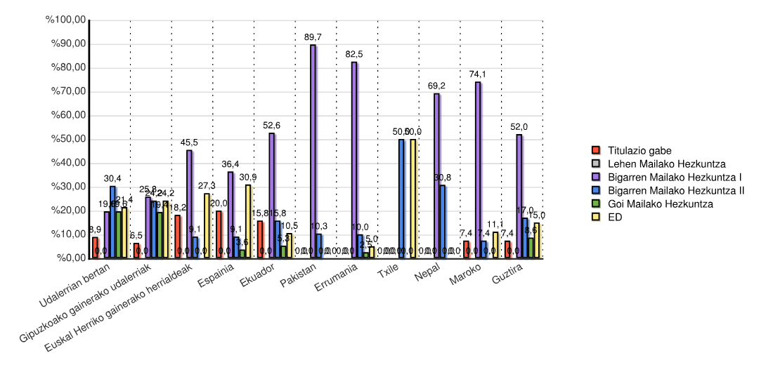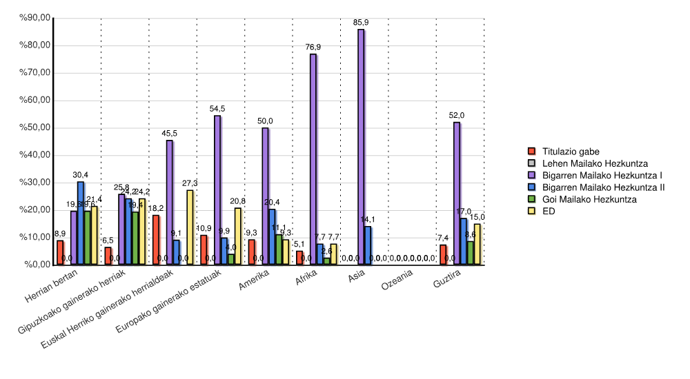 | Estatua | Titulazio gabe | Lehen Mailako Hezkuntza | Bigarren Mailako Hezkuntza I | Bigarren Mailako Hezkuntza II | Goi Mailako Hezkuntza | ED | Guztira | |||||||