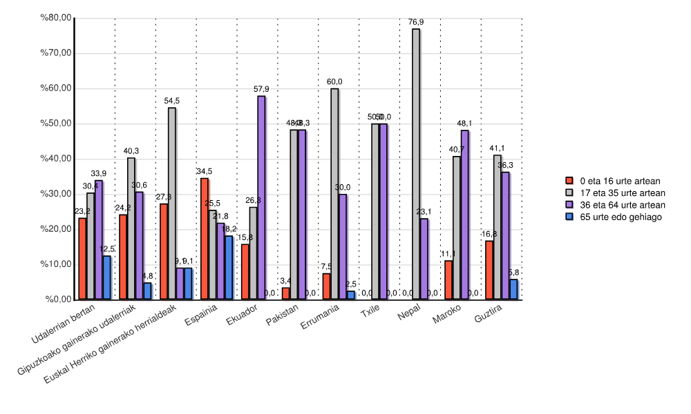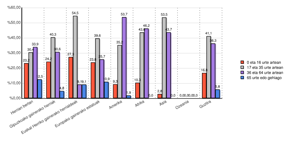 | Udalerrian bertan | 0 | 0,0 | 0 | 0,0 | 0 | 0,0 | 0 | 0,0 | 23 | 41,1 | 9 | 16,1 | 4 | 7,1 | 20 | 35,7 | 56 | 100,0 |