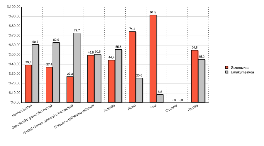 | Euskal Herriko gainerako herrialdeak | 2 | 18,2 | 9 | 81,8 | 0 | 0,0 | 0 | 0,0 | 11 | 100,0 |