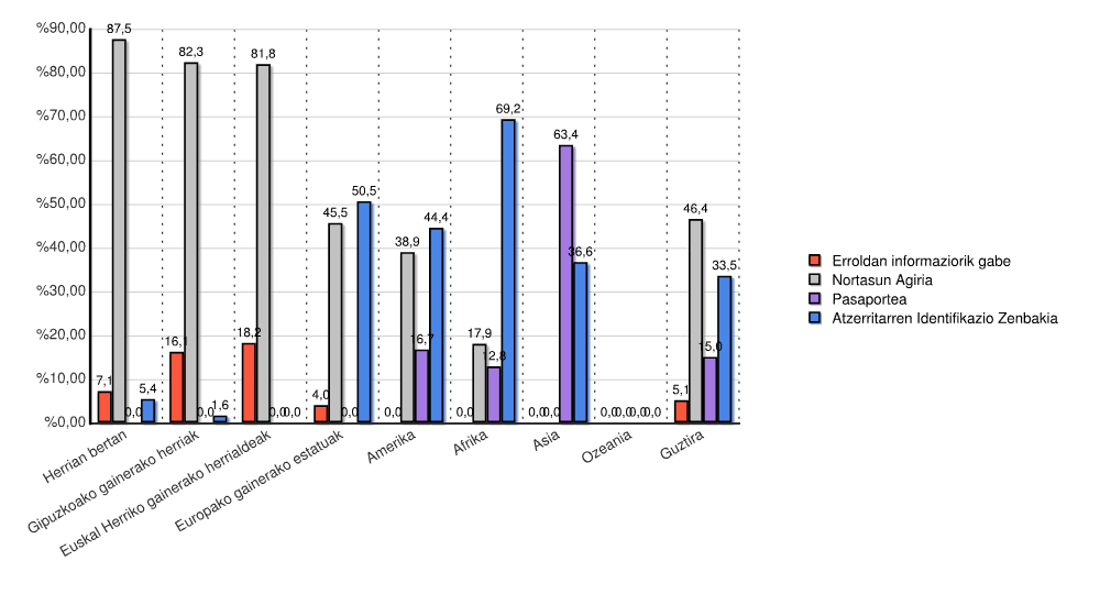 | Kontinentea | Erroldan informaziorik gabe | Nortasun Agiria | Pasaportea | Atzerritarren Identifikazio Zenbakia | Guztira | |||||