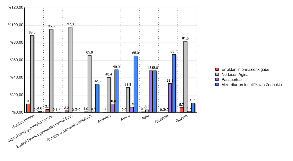 | Kontinentea | Erroldan informaziorik gabe | Nortasun Agiria | Pasaportea | Atzerritarren Identifikazio Zenbakia | Guztira | |||||