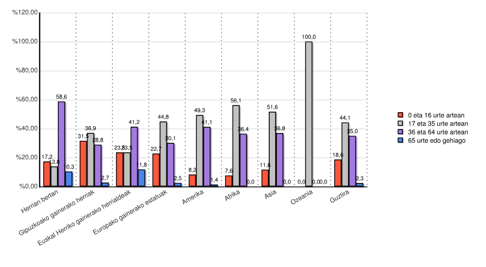 | Euskal Herriko gainerako herrialdeak | 1 | 5,9 | 0 | 0,0 | 6 | 35,3 | 2 | 11,8 | 3 | 17,6 | 5 | 29,4 | 17 | 100,0 |