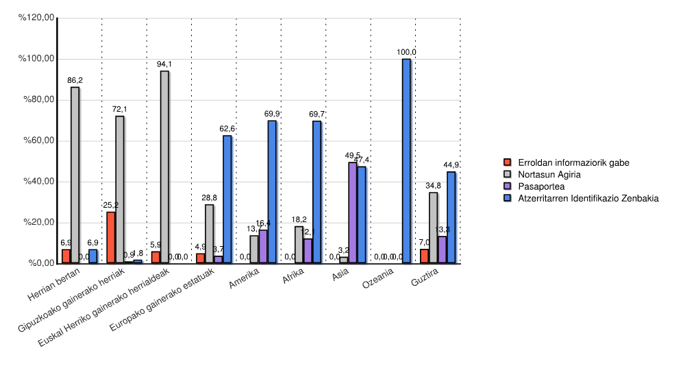 | Kontinentea | Erroldan informaziorik gabe | Nortasun Agiria | Pasaportea | Atzerritarren Identifikazio Zenbakia | Guztira | |||||