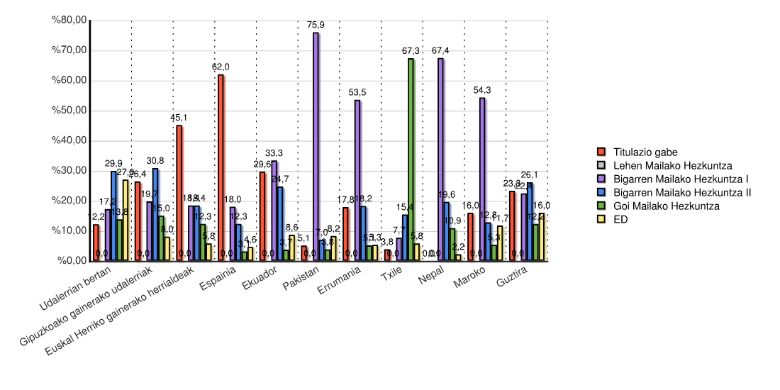 | Estatua | Titulazio gabe | Lehen Mailako Hezkuntza | Bigarren Mailako Hezkuntza I | Bigarren Mailako Hezkuntza II | Goi Mailako Hezkuntza | ED | Guztira | |||||||