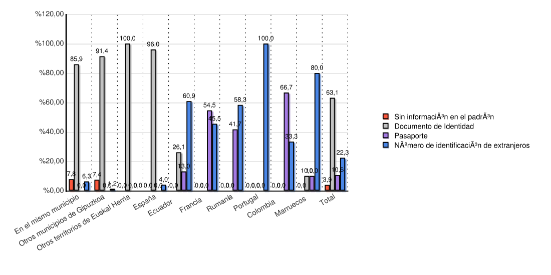 | Estado | Sin información en el padrón | Documento de Identidad | Pasaporte | Número de identificación de extranjeros | Total | |||||