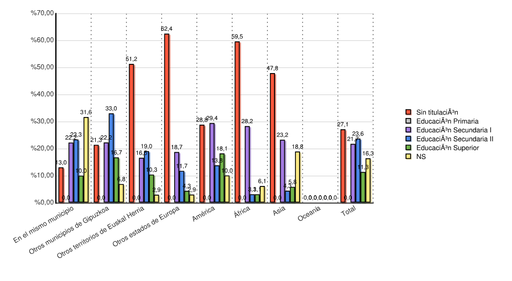 | Continente | Sin titulación | Educación Primaria | Educación Secundaria I | Educación Secundaria II | Educación Superior | NS | Total | |||||||