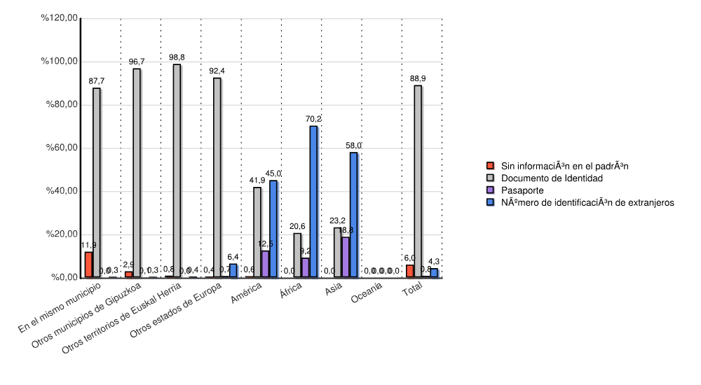 | Continente | Sin información en el padrón | Documento de Identidad | Pasaporte | Número de identificación de extranjeros | Total | |||||