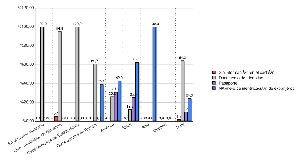 | Continente | Sin información en el padrón | Documento de Identidad | Pasaporte | Número de identificación de extranjeros | Total | |||||
