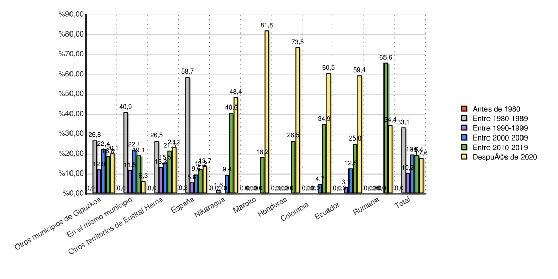 | Otros territorios de Euskal Herria | 0 | 0,0 | 48 | 26,5 | 24 | 13,3 | 28 | 15,5 | 39 | 21,5 | 42 | 23,2 | 181 | 100,0 |