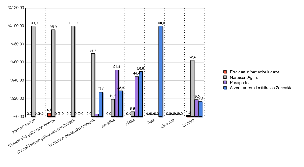 | Kontinentea | Erroldan informaziorik gabe | Nortasun Agiria | Pasaportea | Atzerritarren Identifikazio Zenbakia | Guztira | |||||