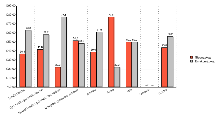 | Euskal Herriko gainerako herrialdeak | 0 | 0,0 | 5 | 55,6 | 4 | 44,4 | 0 | 0,0 | 9 | 100,0 |