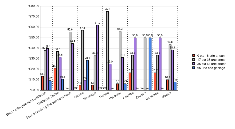 | Euskal Herriko gainerako herrialdeak | 1 | 11,1 | 0 | 0,0 | 3 | 33,3 | 2 | 22,2 | 3 | 33,3 | 0 | 0,0 | 9 | 100,0 |