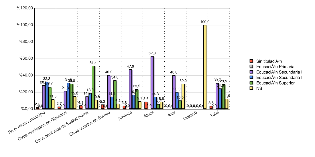 | Continente | Sin titulación | Educación Primaria | Educación Secundaria I | Educación Secundaria II | Educación Superior | NS | Total | |||||||