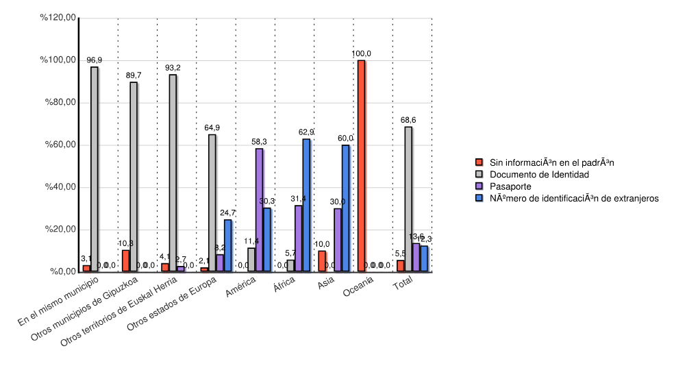 | Continente | Sin información en el padrón | Documento de Identidad | Pasaporte | Número de identificación de extranjeros | Total | |||||