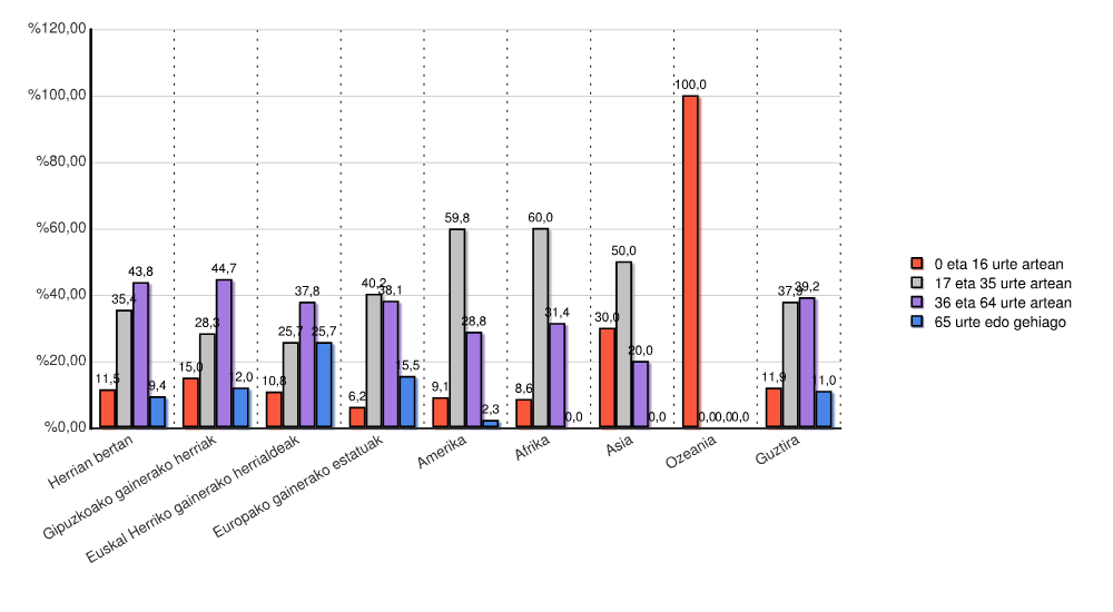 | Kontinentea | 0 eta 16 urte artean | 17 eta 35 urte artean | 36 eta 64 urte artean | 65 urte edo gehiago | Guztira | |||||
