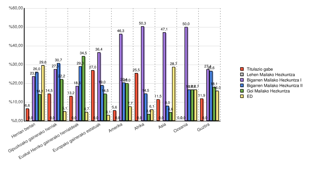 | Kontinentea | Titulazio gabe | Lehen Mailako Hezkuntza | Bigarren Mailako Hezkuntza I | Bigarren Mailako Hezkuntza II | Goi Mailako Hezkuntza | ED | Guztira | |||||||