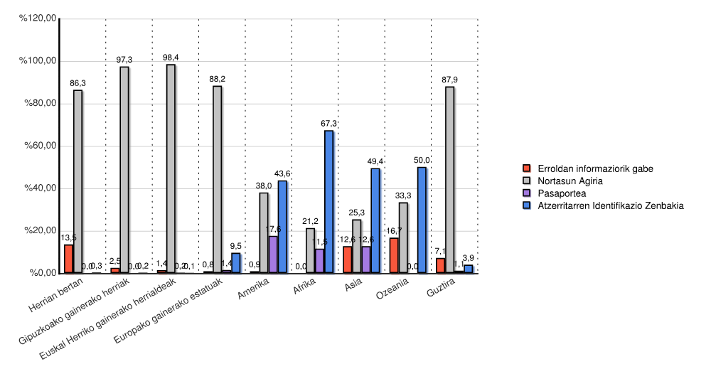 | Kontinentea | Erroldan informaziorik gabe | Nortasun Agiria | Pasaportea | Atzerritarren Identifikazio Zenbakia | Guztira | |||||